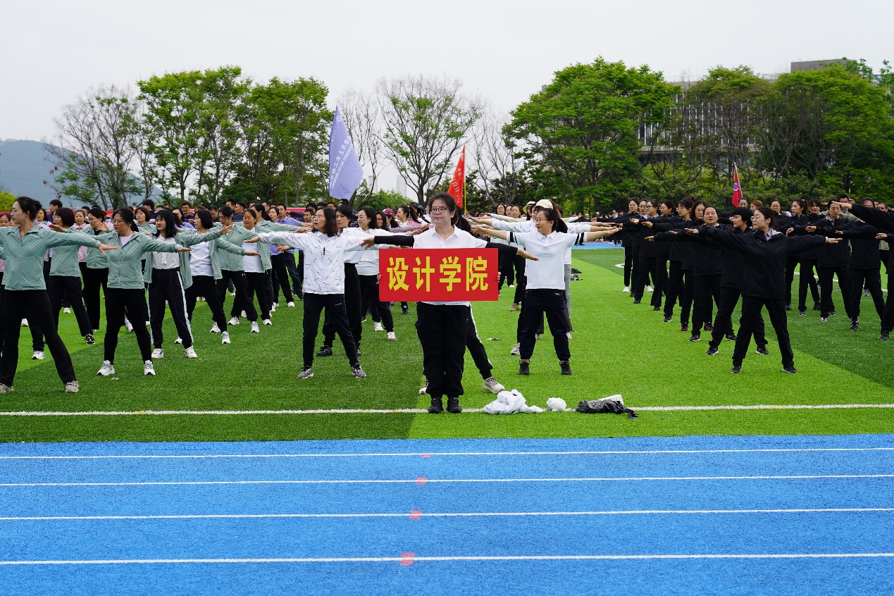 开幕式结束后,设计学院教职工代表队参加第九套广播体操表演,大家动作整齐划一,彰显了设计学院团结协作的团队精神。