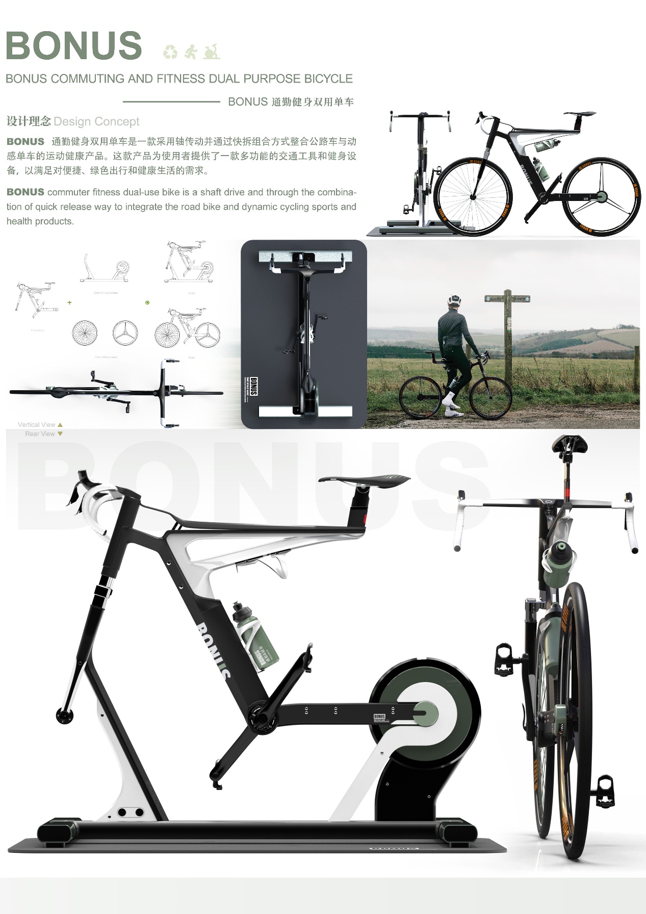BONUS 通勤健身双用单车是一款采用轴传动并通过快拆组合方式整合公路车与动感单车的运动健康产品,为人们提供了一款多功能的交通工具和健身设备,可以满足用户对于便捷、绿色出行和健康生活的需求。通过将公路车与动感单车的功能结合,辅以储电助力和快拆式设计,使其具备了代步、锻炼和电能利用的多重功能,既解决了人们对于灵活性、便利性和环保性的追求,也促进了可持续出行和健康生活方式的融合。