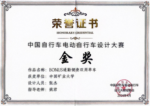 近日,由建筑与设计学院姚君教授指导、研究生张杰完成的设计作品《BONUS通勤健身双用单车》,在2024中国自行车电动自行车设计大赛中获得金奖,这是该作品在继韩国K-Design Award、IBDC全球自行车设计大赛金奖后所获又一专业奖项。同时,中国矿业大学荣获大赛优秀组织奖。