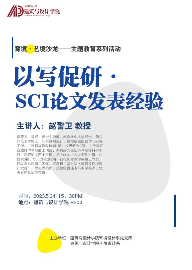 为推进环境设计系教学科研工作,继续提高全系教师科研水平、促进科研交流,环设系支部赵警卫教授结合自身科研实践经验,做了“以写促研:SCI论文发表经验”报告。赵教授从“读、想、写、投”四个方面分享了高质量学术论文的写作重点。报告结束后,丁昶老师进行总结发言,她首先感谢赵老师无私细致的分享,鼓励教师做好规划,扎实积累,切实提高自身科研能力,积极撰写高水平论文,推动全系科研水平提升。