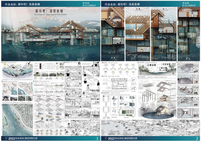 该团队的作品立足渔民退捕转产这一背景,提出“运河生态圈”的设计理念,将河上渔屋、藻基鱼塘等富有创意的设计元素融入方案,形成生产、生活、生态三者的“循环”关系,为当地水域生态环境改善、渔业资源保护、渔民生产生活条件改善和文旅业态良性发展提供了可资借鉴的现实路径。