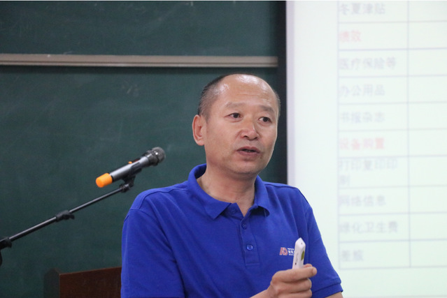 冀朋元副院长在大会上作财务工作报告,并对《学院奖励性年度综合绩效考评分配办法(讨论稿)》进行解读。