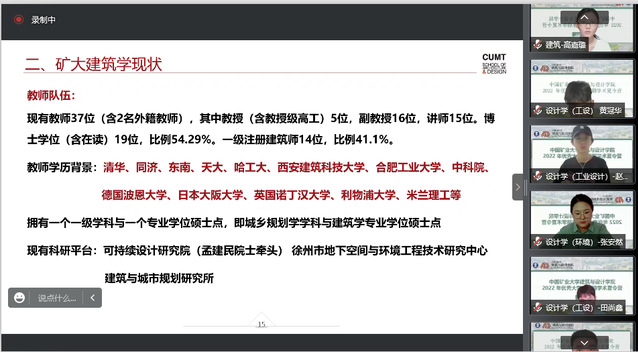 9日上午,学院组织了开营仪式。学院副院长孙良教授,院教授委员会主任、规划系主任常江教授,建筑系主任林祖锐教授,环境设计系主任丁昶教授,工业设计工程学科负责人张昆副教授,出席参加了仪式。副院长姚君主持开营仪式,并介绍了学校和学院的基本情况。参加仪式的各学科老师先后介绍了本学科和专业的研究方向、师资力量、科研成果、研究生培养等。仪式上,各学科和专业分别发布了设计实践课题。开营仪式后,分组进行了学术讲座、在校和毕业研究生分享交流。