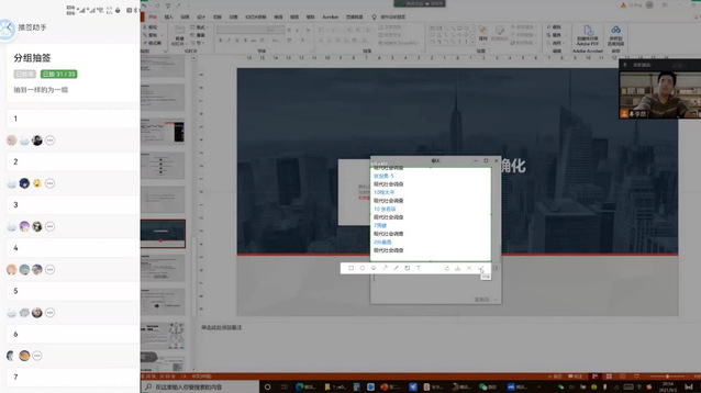 3、利用“人像画中画”增强学生上课的仪式感。学生进行PPT汇报演示时,要求学生打开摄像头,开启共享屏幕中的“人像画中画”功能,这样,学生的头像会以剪影的方式存在于汇报画面中,学生会更加注意汇报的仪容仪态,随着演讲过程中,报告人神情的变化,其他听众也更容易与演讲者产生互动。对于汇报人和听众而言,可以提高交流的深度。