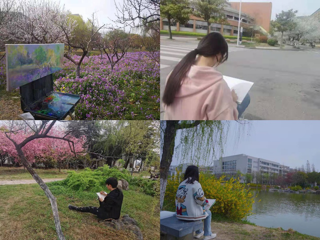 环境设计系刘群山老师组织学生们到校园写生,通过线上视频同步教学示范,学生们与老师共绘画出校园中的春日美景。