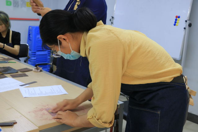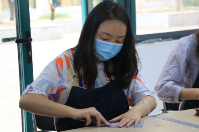 范乾坤老师首先向大家介绍了制作书签的木料材质及各自的特点,并讲解演示了书签磨制方法和砂纸选择。郭屹老师从中国传统文化的角度对书签木材、挂穗的颜色和特点进行了讲解,指导同学们选择合适的书签搭配。通过老师们的讲解,同学们对书签磨制有了基本了解。各自选取木料后,师生们开始打磨,房间内满溢着木材特有的香气,通过打磨的木料表面逐渐光滑,边缘更加圆润,初具书签形态。之后,在老师们的指导下,大家对书签进行涂蜡防护,一枚枚美丽的书签在大家手中呈现。