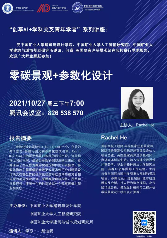 受中国矿业大学建筑与设计学院、中国矿业大学建筑与城市规划研究所以及中国矿业大学人工智能研究院3D视觉与空间重构技术研究中心、智慧地学与新能源研究中心邀请,英国皇家资深注册景观师何睿面向智慧设计规划领域师生举办了“零碳景观+参数化设计”学术报告。何睿,高级工程师,国际顶级景观事务所玛莎施瓦兹及合伙人伦敦本部项目总监,主要活跃于欧洲范围,主持与参与国际与国内多项重大规划和景观项目,工作经验含盖全球各大洲。参数化设计经验包括:城市肌理模拟及分析,行人行为数字模拟,小气候环境分析,景观设计模拟与工程分析,零碳景观设计模拟及计算等。