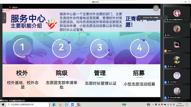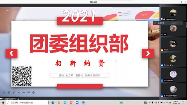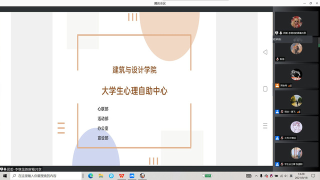 会议伊始,周天涯老师发表动员讲话,为同学们介绍了接下来宣讲的各个团学组织,并鼓励大家积极参与部门面试,丰富自己的大学生活,锻炼自己的能力以促进身心的全面发展。首先,学生会主席张晨阳简要地介绍了建筑与设计学院学生会的基本概况。接着,团委学生会各部门进行了宣讲。紧随其后的是,大学生传媒中心主任叶维芬详细介绍了传媒中心的独特之处,并且向新生们讲述大学生传媒中心在学院宣传工作中的重要性地位。随后,党员工作站、行健服务分队、大学生心理自助中心、科技创新协会、青年志愿者协会、社团联合会也结合精心制作的PPT向大家讲述自己部门的负责内容,并通过生动的例子展现了部门的职能特点。至此,这次团学组织线上宣讲会到此结束。