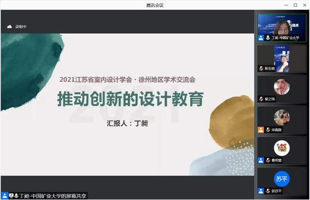 2021年9月25日上午9:00-12:00,江苏省室内设计学会徐州地区室内设计学术交流会在线上成功举办。本次会议主题为“涌现:观念与技术的交互”,由江苏省室内设计学会、江苏省室内设计学会徐州地区组委会主办,中国矿业大学建筑与设计学院承办,徐州普诺顿家具有限公司提供赞助,以腾讯会议方式在线进行。这是江苏省室内设计学会徐州组委会组织的徐州地区业内首次学术会议,吸引了徐州地区室内设计行业众多专家、学者及相关人士参会。会议内容主要为徐州业内企业设计、施工人员与在徐高校师生开展室内设计学术交流,企业展示优秀的工程项目或投标方案,高校展示师生代表性设计学术的研究成果与获奖方案,共有八位嘉宾进行了主题学术汇报。本次会议由中国矿业大学矫苏平教授主持,中国矿业大学丁昶教授担任会议的学术主持。