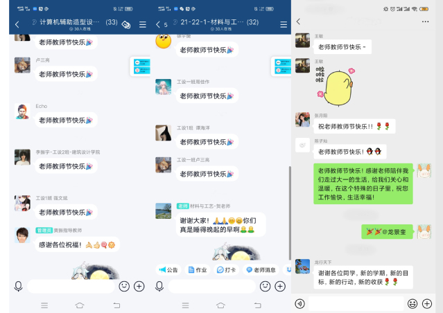 学院同学们也通过网络课堂、QQ群、微信群等途径,向老师们送上节日的祝福。建筑与设计学院用亲切、温暖的方式表达了对教师们深切的关切和鼓励,肯定了教职工默默付出、无私奉献的精神。学院老师们表示,感谢学院长期以来的关爱,在未来会更加努力,坚守岗位,为教育事业添砖加瓦。奋斗新时代,展现新作为,再做新贡献。