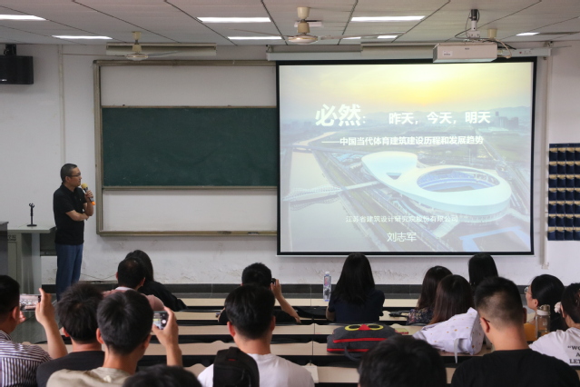 6月23日下午2点,江苏省建筑设计研究院有限公司副总建筑师、综合创新研究院刘志军院长,建筑与设计学院院长罗萍嘉,副院长孙良、姚君等院领导,建筑学相关教师以及部分同学一同参会。本次聘任仪式由姚君与孙良两位副院长开场主持,罗萍嘉院长为刘志军教授颁发教授聘书。随后,刘志军教授即为各位到场的老师、同学们展开主题为“中国当代体育建筑建设历程和发展趋势”的学术报告演讲。演讲中刘志军教授以体育场馆的建筑设计为主,讲述了中国体育建筑的发展历程、影响体育建筑发展的多重因素、体育建筑的断代研究与体育建筑发展新趋势的几个猜想等方面的内容与观点,引发了老师与学生的深思。