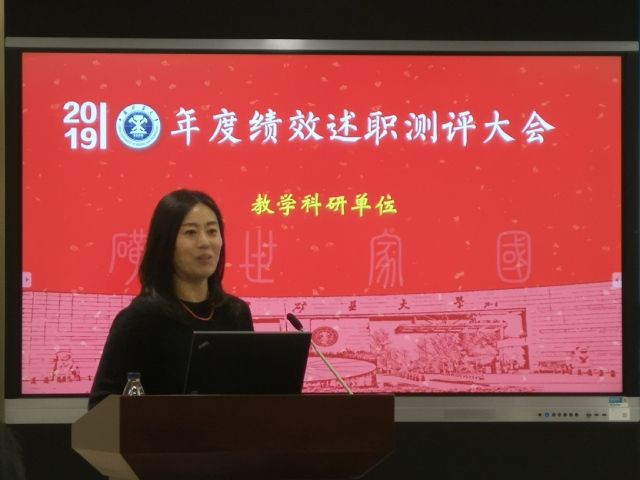 在述职中,罗萍嘉院长对照学校的绩效指标,高度总结了学院2019年度工作,从党建工作、人才培养、科学研究、学科建设、师资队伍建设五个方面进行了述职。