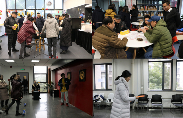 文艺表演结束以后,全体教职工纷纷参与小游戏。本次联欢会设置了10项趣味游戏,包括掷飞镖、颠乒乓球、猜谜语、打羽毛球、打保龄球、转圈抢凳子等,参与者可以根据成绩的高低领取不同的奖品。老师们参与游戏很广泛、很积极,都使出浑身解数在游戏中大展身手,各个项目都非常热闹有趣,现场充满欢声笑语。