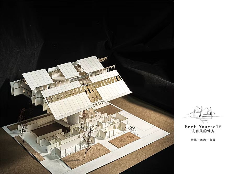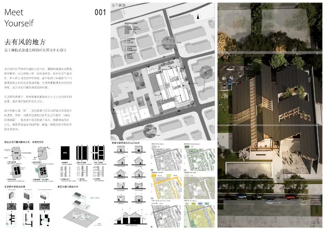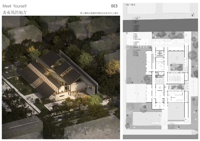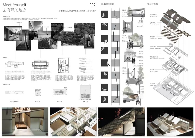 朱钰铭同学参赛作品以徐州的地域建筑特征为主题,从徐州传统民居提取平面原型,扎根奎园烟火,以廊院交织构建空间,力求让奎园烟火与徐州文化通过建筑这一载体进行文化融合。通过“风”这一环节将设计要素加以串联,“风”既是物理存在,也是缝合情感的符号,通过空间变化和材料运用,让社区生活“可视可感”,尝试打破邻里交流的隔阂。同时,以“风”打破交流的桎梏,用渗透性空间、可变功能,让建筑成会呼吸的 “24h社区微缩剧”,传播地域文化,书写社区生活史诗,让奎园烟火与徐州文化在廊院穿风中重燃,续写邻里温情新篇。
