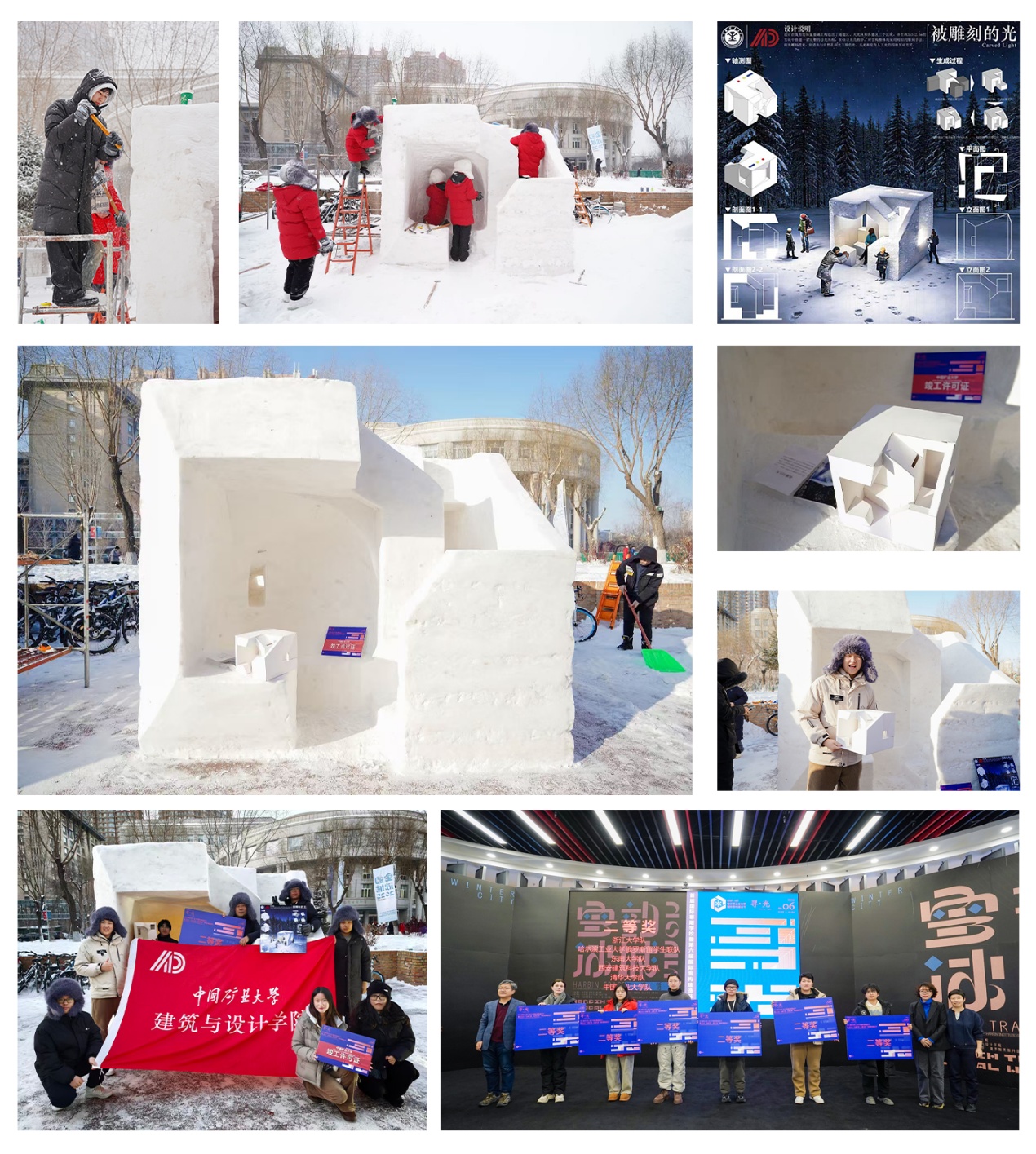 我院雪构团队由8名研究生组成,在李翔宇院长、姚君教授、张一兵教授和王诗琪老师的带领下赴哈尔滨工业大学主赛场,团队雪构作品《被雕刻的光》在最后的评审中荣获二等奖。本届赛事既是冰雪建筑技艺的学术切磋,更以 “寻光” 为题厚植思政底色,中外师生以雪为媒、以筑为语,在冰天雪地中探寻空间与光影的共生之美,于交流协作里传递匠心与人文温度,让冰雪艺术成为连接青春梦想与建筑情怀的纽带。