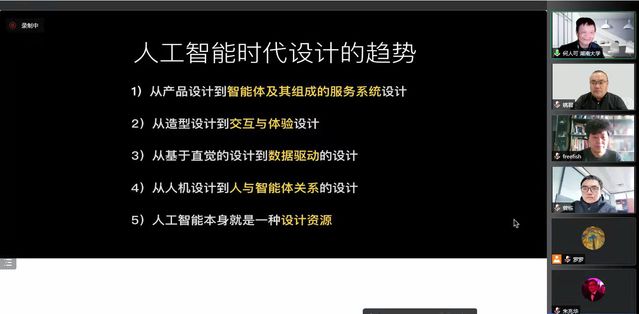 讲座中,何人可教授从中国设计所面临的转型问题作为切入点,指出在坚持文化自信的同时,中国设计必须进行一场“文艺复兴”,当今时代的设计要更加聚焦于人本主义和可持续的设计。他结合新冠疫情的时代背景,认为对于设计和设计教育既是挑战又是机遇,为助力我国“双循环”新发展格局,设计要坚持面向世界科技前沿、面向经济主战场、面向国家重大需求、面向人民生命健康。何人可教授还与师生分享了湖南大学艺术设计学院关于设计和设计教育未来发展的蓝图,进一步从智能装备、智慧出行、数据智能与服务设计、智慧健康、可持续与生态设计、数字文化创新六大模块介绍了设计教育的发展方向。他还结合与小米、迈瑞、京东云等实践合作项目,分析了人工智能时代的设计趋势,期望大家明确自身责任,致力于为全社会和全人类服务。讲座后,何人可教授还与学院师生进行了线上交流和互动。