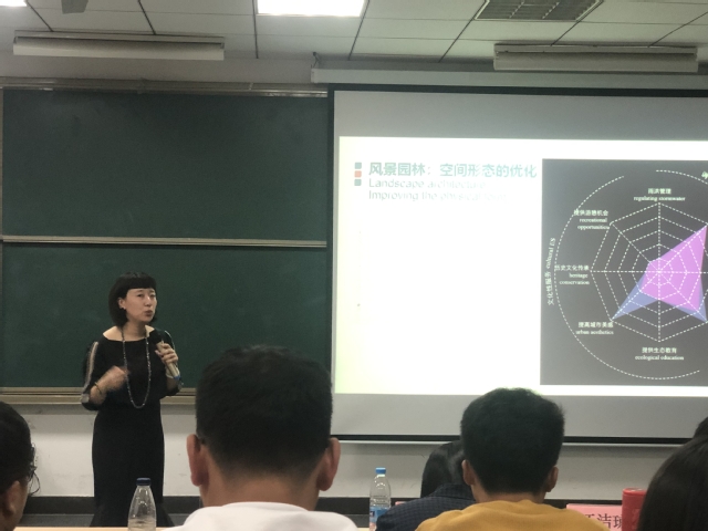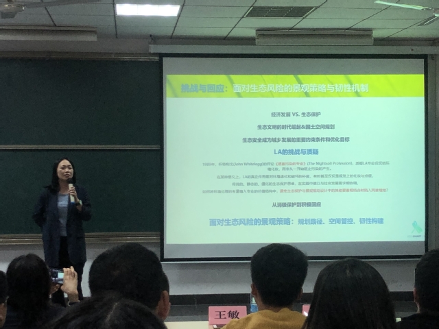 两位老师围绕建筑与生态的关系为同学们展开了讲解。本次讲座分为两大主题。王敏副教授以“面对生态风险的景观策略与韧性机制”为主题,从三种不同情境下的实践探索入手,分别评价了它们的生态风险和景观特征。其中又着重分析了安徽省宁国市中心的区域概况,向同学们讲述了当地成功实现由水安全向水文化转变的事例,最后告知同学们面对生态风险的景观策略应从规划路径、空间管控、韧性构建三方面着手。汪洁琼副教授以“知否?识否?——学科融合的循证设计与生态实践”展开了主题讲座,提出生态实践践行者的“知”与“识”的概念,针对从知到识、从识到悟、从悟到慧三个角度,指导同学们如何在实践中进一步拓展知识。