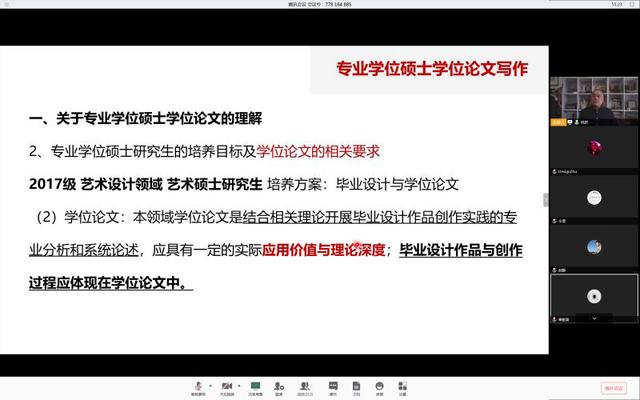 3月20日下午,建筑与设计学院副院长姚君教授以在线方式(腾讯会议),面向学院设计类相关专业学位硕士研究生,进行了题为“专业学位硕士学位论文写作”的辅导报告,学院院长罗萍嘉全程参加了此次报告会,报告会共计200余名同学在线参加。