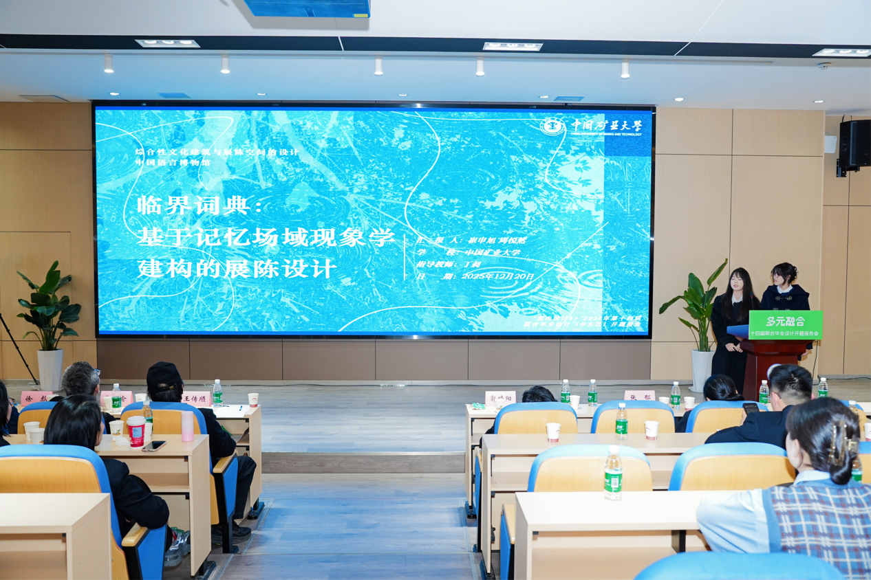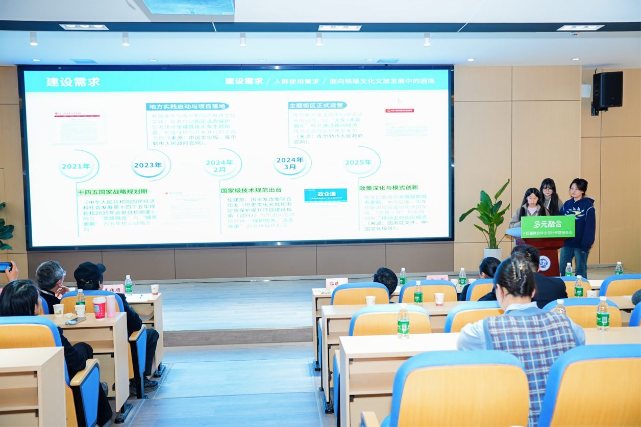 在开题报告环节,我院两组学生先后进行了汇报。由在丁昶教授指导下,崔申旭、周悦然两位同学汇报了题为“临界词典:基于记忆场域现象学建构的展陈设计”的项目构想;随后,仝晓晓副教授指导,关舒元、苗若琳、罗曼曼三位同学以“从锈迹到‘秀集’——坐着火车到新疆主题街区广场文旅赋能与活态保护设计研究”为题,阐述了其设计思路与初步方案,同学们围绕选题背景、研究框架与初步构思展开了详细阐述,展现出扎实的前期调研与清晰的逻辑思维。与会专家对两组汇报均给予积极评价,并就文化叙事的空间转译、跨学科方法在设计中的运用、公共空间的情感营造等维度提出了中肯建议,鼓励同学们在后续设计中进一步拓展思考深度,强化设计表达的创新性与整体性。