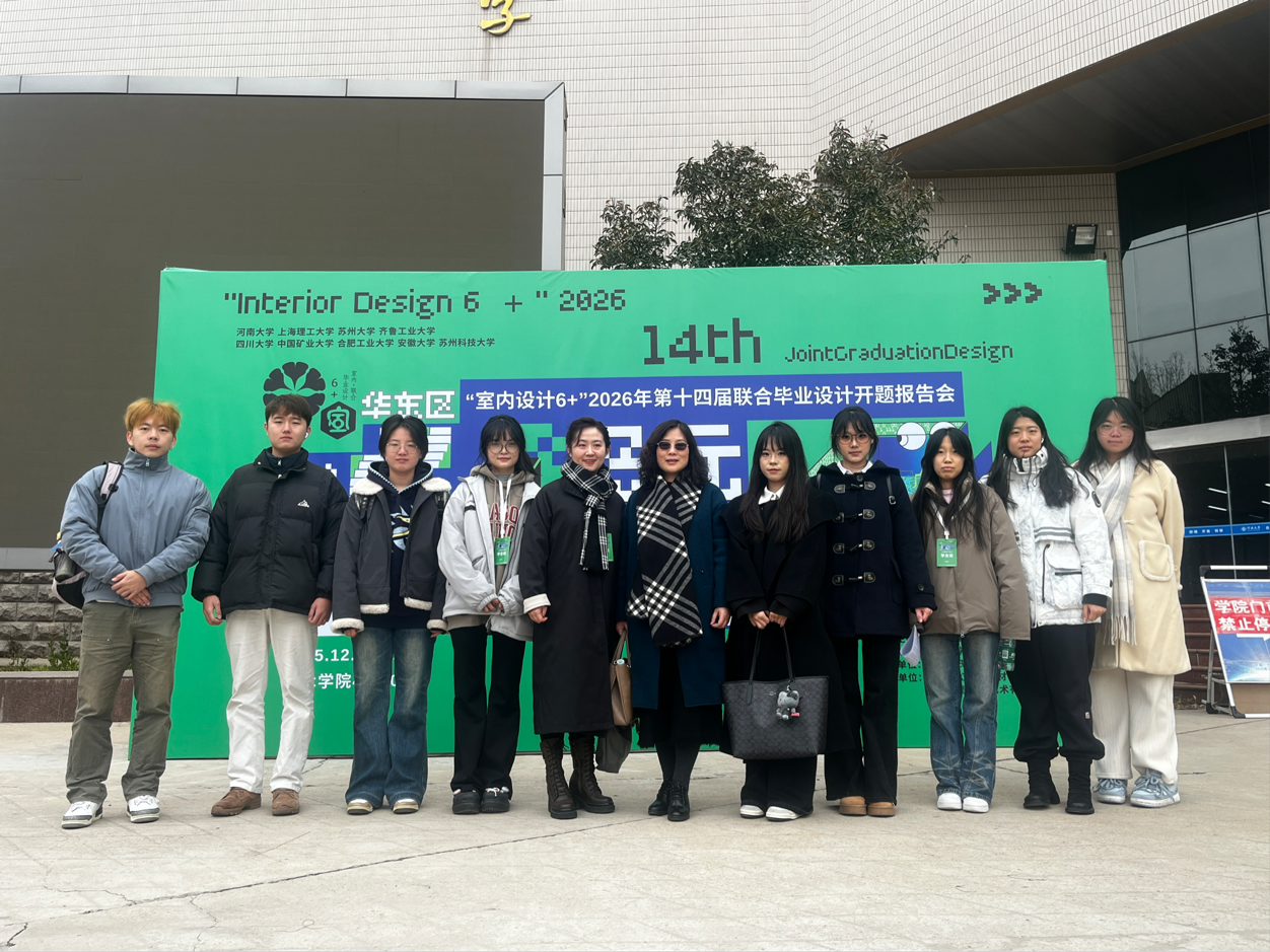 12月20日,“室内设计6+”2026第十四届联合毕业设计(华东区)开题报告会在河南大学美术学院举行。我校建筑与设计学院环境设计系主任丁昶教授、副系主任仝晓晓副教授带领带了10位环境设计专业本科毕业生去参观学习,其中环境设计专业关舒元、苗若琳、罗曼曼、崔申旭、周悦然五位同学组成的两支毕业设计小组参会,并作开题汇报。