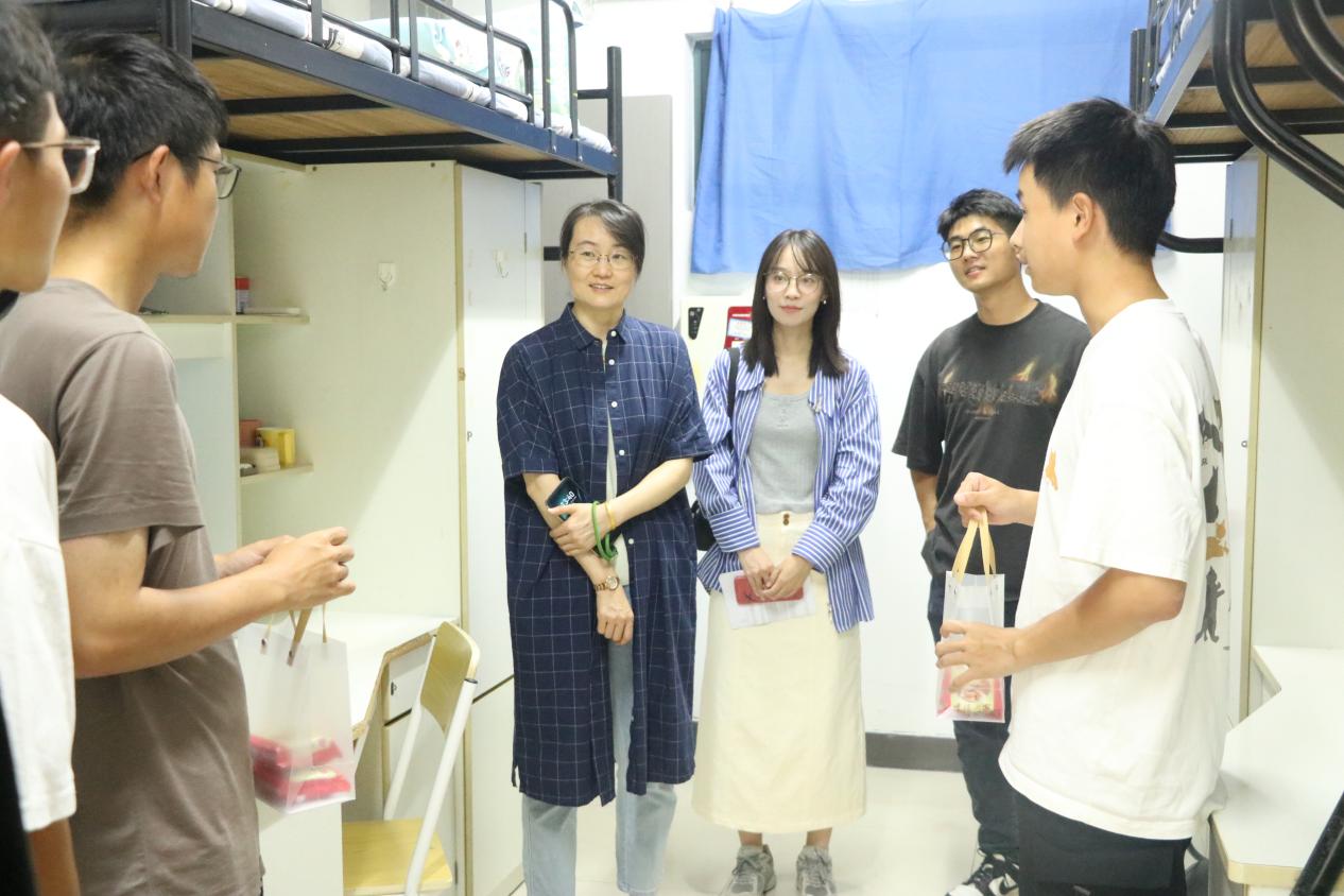许梓楠副书记为同学们送上节日祝福并赠送了月饼。她询问了同学们开学以来的学习和生活情况等,对宿舍舍风建设提出要求,她希望来自不同地方的同学们能够互相帮助、相互支持,共同建设整洁、温馨的宿舍环境。