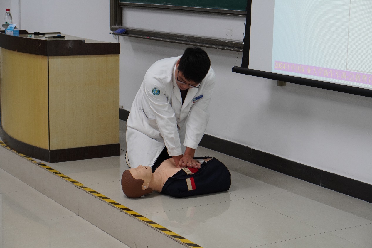培训期间,医护志愿者通过理论知识讲解和现场示范的方式对同学们进行了急救知识的全面教学。他结合教学视频,为同学们介绍了判断方法及现场抢救措施,并讲述了自动除颤器等急救器械的使用方法。随后,同学们在志愿者的指导下,通过实践操作,学习了施救过程中“评估环境、判断意识、翻转体位、判断呼吸、呼救救援以及胸外心脏按压”等步骤。