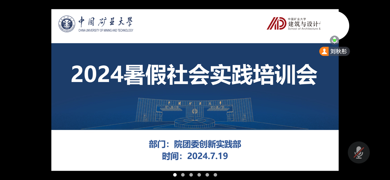 7月19日晚上,建筑与设计学院以腾讯会议线上召开2024年暑假社会实践培训会,2023级辅导员姚昊及学院社会实践团队骨干成员参加。会议由院团委学生副书记刘秋彤主持。