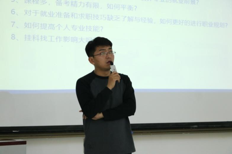 经验分享结束后,林仁强老师解答了同学们提出的问题、面对当前个人发展的困惑等,介绍了学院近三年本科毕业生的去向情况。他以详实的数据为基础,展示了学院本科毕业生保研、考研、出国留学以及就业分布等关键指标,对当下就业环境进行深入分析,帮助学生进一步认清就业市场,引导学生从职业发展的需求出发,挖掘自身优势,制定合理计划,逐步提升就业核心竞争力。针对学院学生面临的现实困境,他建议同学们提高专业能力,不断拓展视野,努力把握机会,积极寻求突破。林老师强调培养方案是学生制定学习计划、明确学习目标的重要依据,同学们要严格按照培养方案的要求完成各门课程和各个环节的学习,确保顺利毕业。