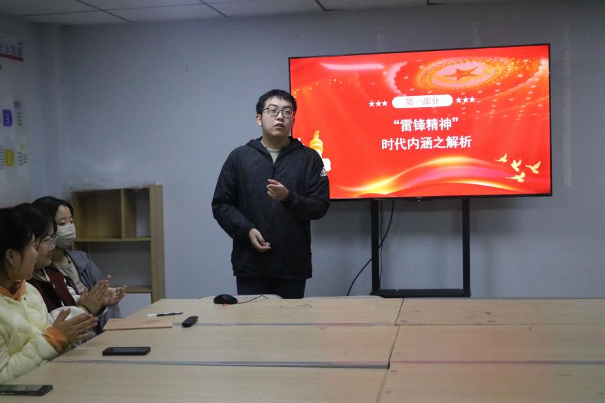 单羽恒从“雷锋精神时代内涵”“雷锋精神求证”“雷锋精神诠释”以及“新时代弘扬雷锋精神途径”等四个方面进行汇报,并与现场同学进行交流互动,他表示3月是“学雷锋月”,大学生要通过学习雷锋故事感悟雷锋精神,身体力行积极践行“奉献、有爱、互助、进步”的志愿精神,争做新时代雷锋精神传人。