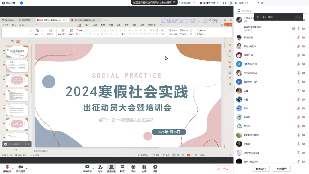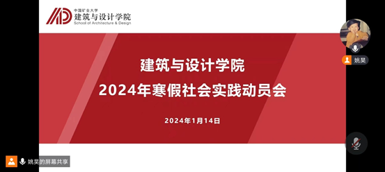 1月24日下午,建筑与设计学院通过腾讯会议方式举行了2024年寒假社会实践出征动员大会暨培训会,院团委书记周天涯、23级辅导员姚昊及29支社会实践团队的60余名同学参加。会议由院团委实践部部长刘秋彤主持。