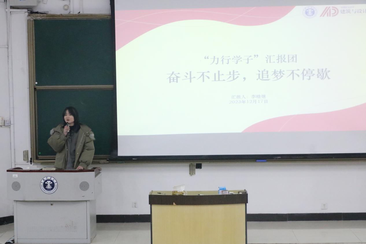 12月17日晚,建筑与设计学院在博2楼C102教室召开“力行学子”报告团宣讲会。2023级辅导员姚昊,“力行学子”报告团代表秦苏东、李晗煜、吴妍萱、王奕凯,2023级全体本科生参加了报告会。报告会由姚昊老师主持。