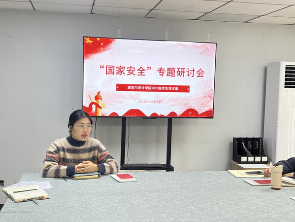 12月26日中午,建筑与设计学院2022级学生党支部在竹四党工委会议室开展了“国家安全”专题研讨会,支部全体党员参加,会议由党支部书记陈文雯老师主持。