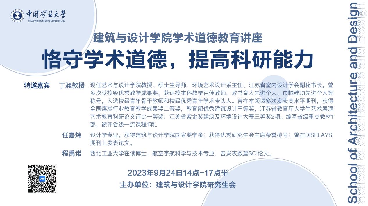 为加强2023级研究生学术道德和规范教育,引导新生树立学术道德和学术规范意识,帮助新生进一步提升科研能力,建筑与设计学院研究生会于9月24日下午,以腾讯会议方式成功举办学术道德教育讲座。