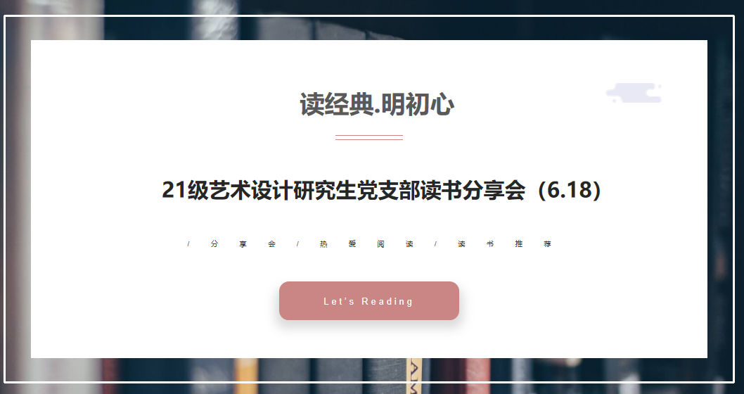 6月18日晚,建筑与设计学院举办第二十二期“读经典·明初心”研究生党员读书分享会。本次读书分享会采用线上方式进行,21级艺术设计研究生党支部全体党员参加。会议由党支部书记孙垚主持。