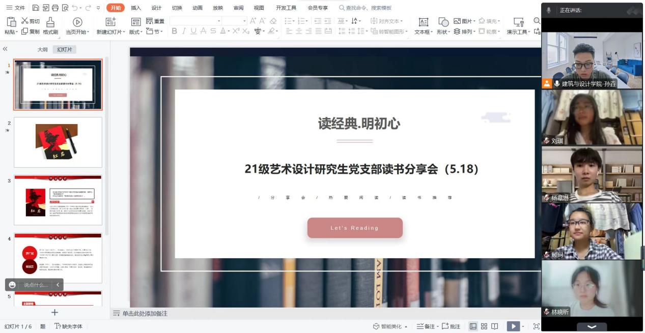5月18日晚,建筑与设计学院举办第十五期“读经典·明初心”研究生党员读书分享会,本次读书分享会采用线上方式进行。21级艺术设计研究生党支部全体党员参加,会议由党支部书记孙垚主持。