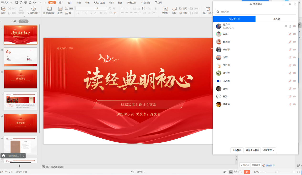 4月21日晚,建筑与设计学院举行2023年第九期“读经典·明初心”研究生党员读书分享会,本次读书分享采取线上方式进行。22级工业设计研究生党支部全体党员参加活动,由党支部书记姬文轩主持。