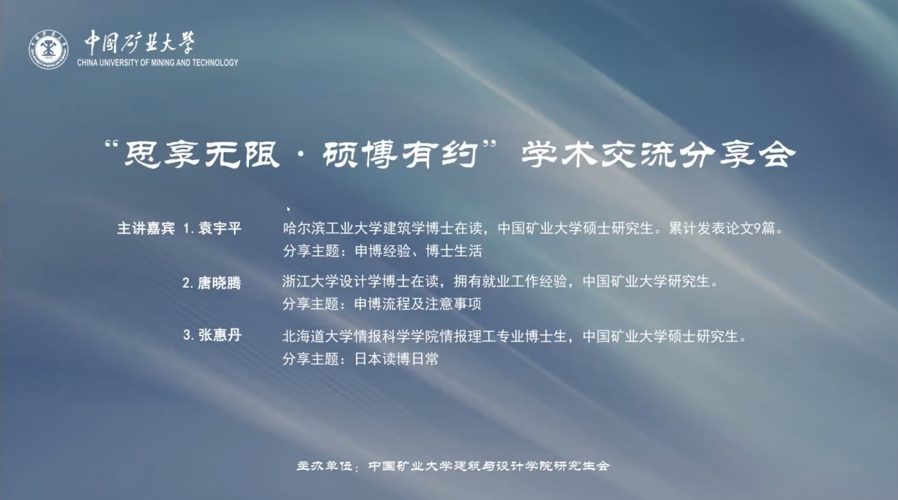 为帮助研究生同学们了解博士申请流程及博士学习的经验,建筑与设计学院研究生会于4月8日组织了“思享无限·硕博有约”学术交流分享会,邀请了三位硕士毕业于中国矿业大学,目前正在攻读博士学位的校友,以腾讯会议方式进行经验分享。分享会由院研会学术部干事鲁苗主持。