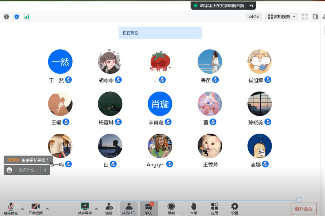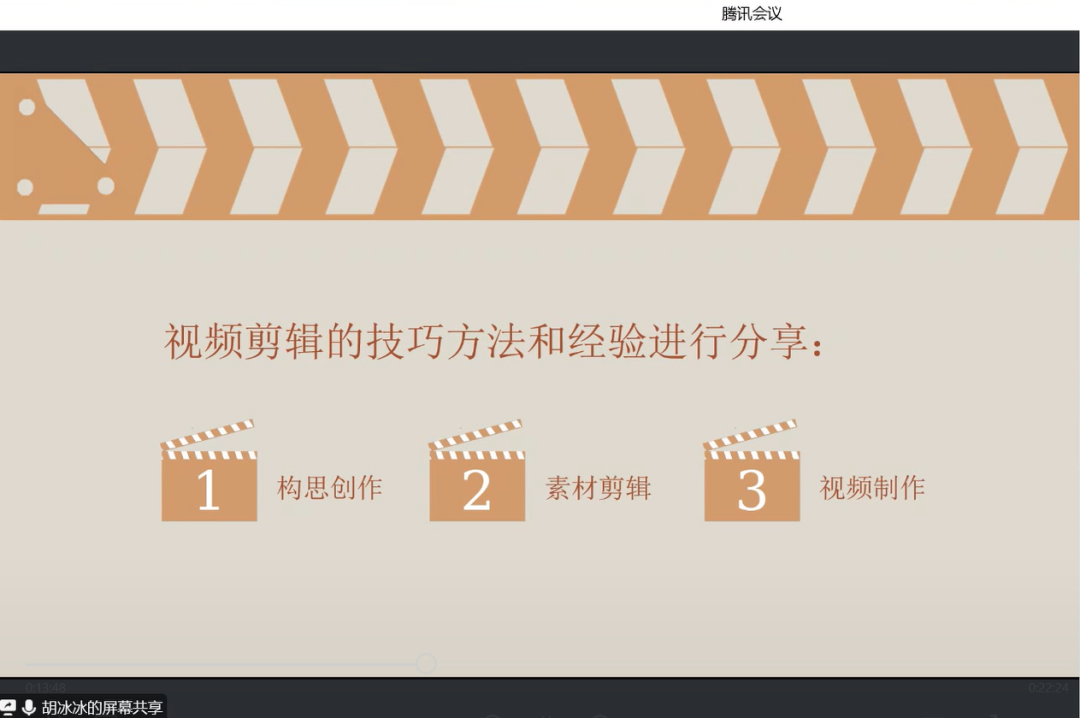 分享会上,王曜同学讲述了他在视频制作方面的心得感悟,以及自身的专业知识、设计审美等方面如何体现在自媒体内容中。张文茜同学以自身经历为例,向同学们分享了短视频制作的经验和建议。院研会宣传部的同学们结合工作体会开展交流,谢婉玉同学从构思创作、素材剪辑、视频制作三个方面进行视频剪辑的技巧方法和经验分享;姚天宁同学从素材积累、题材确立、架构处理、整体协调这四个方面交流视频素材拍摄和剪辑等方面的经验。互动答疑环节中,同学们踊跃提问,相互交流,气氛活跃。