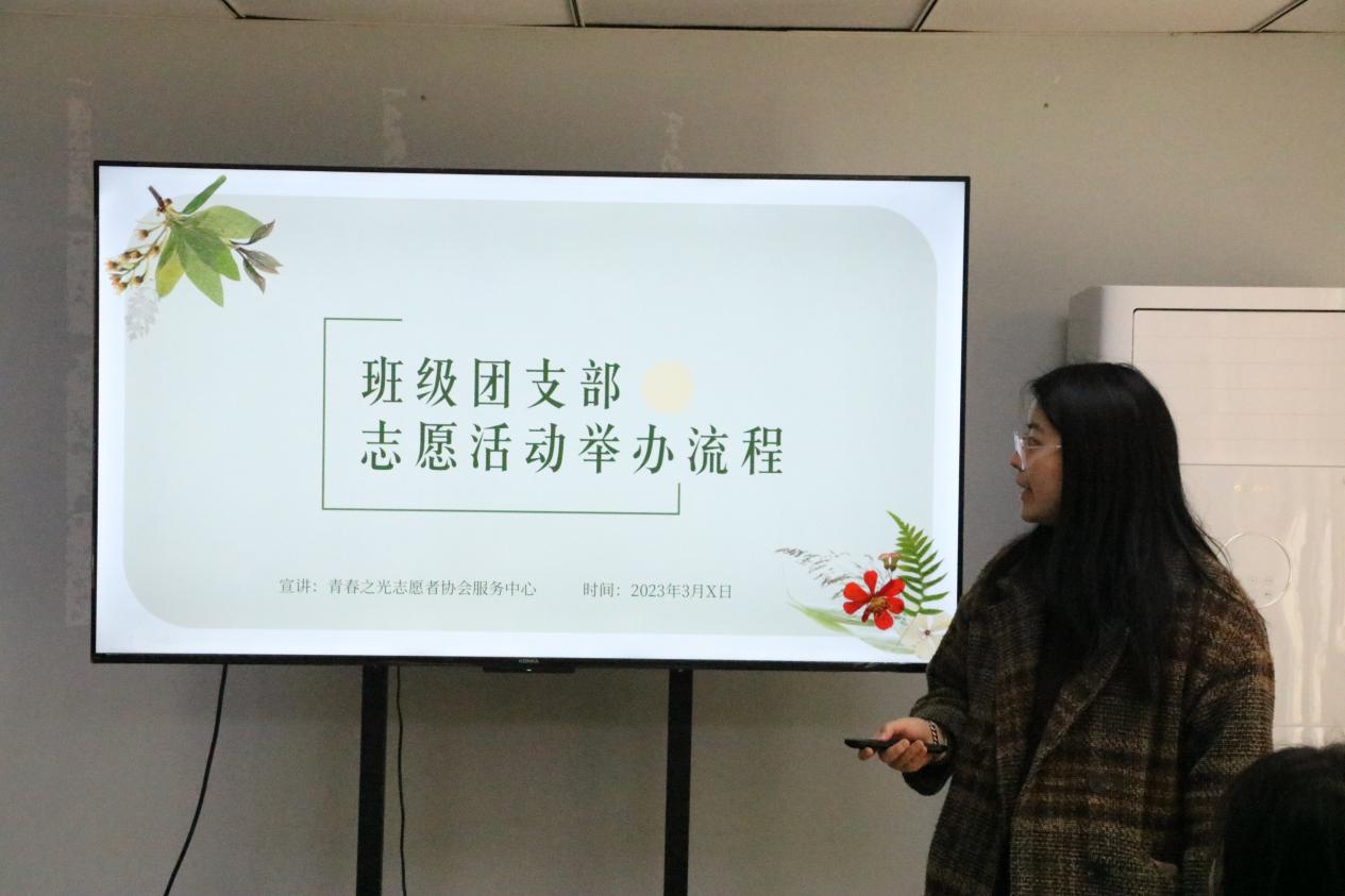孙雨欣同学首先对团支部志愿服务活动举办的流程进行了介绍,从活动策划撰写、活动审批、志愿时长认证等方面逐一讲解,并结合案例具体分享如何写好策划。各班团支部开展志愿服务活动有助于加强团支部凝聚力,助力集体建设。王琛老师强调,班长和团支书应发挥主要班委作用,努力带动班级同学策划组织一批有质量的志愿服务活动,引导同学们乐于奉献,在奉献中增强责任感和为他人,为社会服务的精神。
