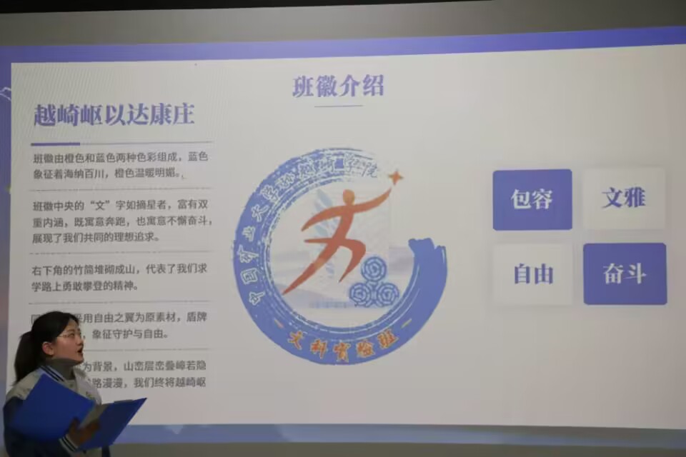 经过前期初赛、复赛的激烈角逐,最终共有来自十一个学院共18个班级进入决赛。本次决赛采用PPT现场展演的形式进行,各班级代表结合学院特色、专业特点详细讲解了本班班徽、班服、班旗作品的元素构成、设计理念和内涵寓意等,展现了独特的班级文化。部分班级还精心准备了集体舞蹈、歌曲,充分展现了团结向上的班级风貌。