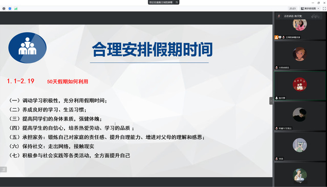 会议伊始,兼职辅导员王琛老师总结了本学期开展的各项学工工作,并对下学期开学时间及各个专业课程安排进行说明,对同学们进行了居家安全教育以及防诈骗教育。随后,辅导员陈文雯老师一对一询问了同学们的假期学习生活计划,表达了对同学们假期学习生活的关心,并就如何合理安排假期时间进行说明,鼓励大家健康作息、快乐学习,陈老师指出各位积极分子更应严格要求自己,要充分利用假期时间,努力提升自身综合能力。最后,陈文雯老师对寒假社会实践的意义、要求等进行说明。