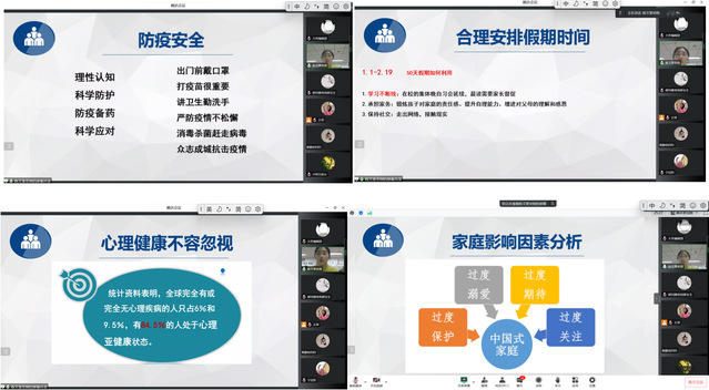 陈文雯老师首先通报了2022级学生第一学期的在校情况,重点强调了党班团建设、学业指导、生涯规划等几个方面的工作及取得的成绩。陈老师对学生后续的课程及考试安排予以说明,并对学生居家学习时间规划及安排给出建议,她提出,为了保障学生居家学习不断线,有效应对开学初的课程考试,已安排以班级为单位,组织线上晚自习,营造浓厚学习氛围,也希望家长能够协助督促孩子居家学习不断线,保持良好作息时间和学习习惯。其次,陈老师就假期安全注意事项进行提醒和说明,包括防疫安全、防溺水、烟花爆竹燃放安全、交通安全、饮食安全、防诈骗等。在“家长课堂”环节,陈老师介绍了大学生心理特点及心理健康有关内容,强调了学生心理健康的重要性,分析了不同类型的家庭教养模式对孩子的影响,希望家长们能够主动关注孩子的想法和需求,在充分沟通的基础上,对孩子的学业和未来规划合理指导、理性期待,建议家长能够学习了解有效沟通的方法,关注、重视和科学引导孩子的情绪问题,正确处理亲子关系。最后,陈老师建议家长要让孩子共同承担家务,在增强孩子责任感的同时学会感恩父母,要让孩子保持良好的社交,走出家门,走出网络,在与人交往与交流中完善自己。