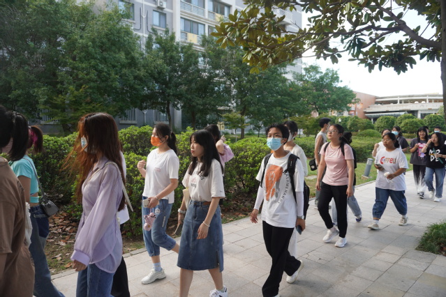 下午4:30,新生备好装备走出宿舍,准备参观感悟大学校园生活的美好。在学生会代表与班级负责人共同组织下,新生迅速排好队伍,开启了解学校教学及生活设施分布情况的“丈量”之行。