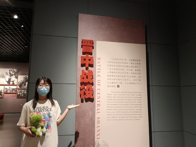 7月27日,成员刘旭敏参观了山西省晋中市晋中战役纪念馆。晋中战役是全国解放战争史上以少胜多、以弱胜强的典型战例。刘旭敏同学以视频的方式为成员们简单介绍了晋中战役的全过程以及晋中战役取得的重大成果和历史性成就。同时,刘旭敏与晋中战役纪念馆中的讲解员展开交流后,对晋中战役又有了更深层次的理解和感悟。