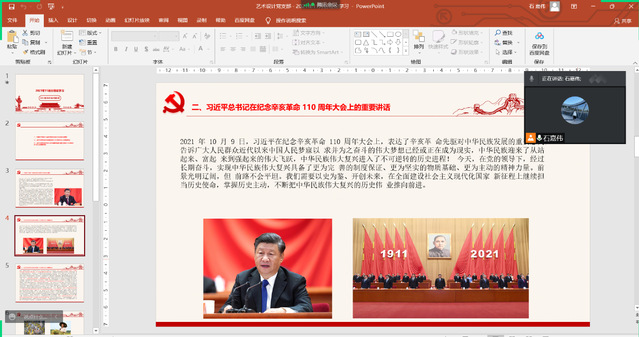 19级视传党支部的钱美岐同学对于《习近平总书记在十九届中共中央政治局第三十六次集体学习上的重要讲话精神》分享个人的感悟,主要针对发展和减排、整体和局部、长远目标和短期目标、政府和市场的关系展开论述,同时也提出作为一名学生党员,更要身体力行的响应党与国家的号召,从身边小事做起。20级艺术设计党支部的王迎郦同学对于习近平总书记的系列讲话分享个人感悟,主要针对为什么要坚定不移的高举中国特色社会主义伟大旗帜展开论述,同时也提出中国共产党是怎样选择了社会主义道路,21级建筑规划党支部的谭志成同学对于《论持久战》分享他的感悟,“卢沟桥事变以来,四万万人一齐努力,最后胜利是中国的。”