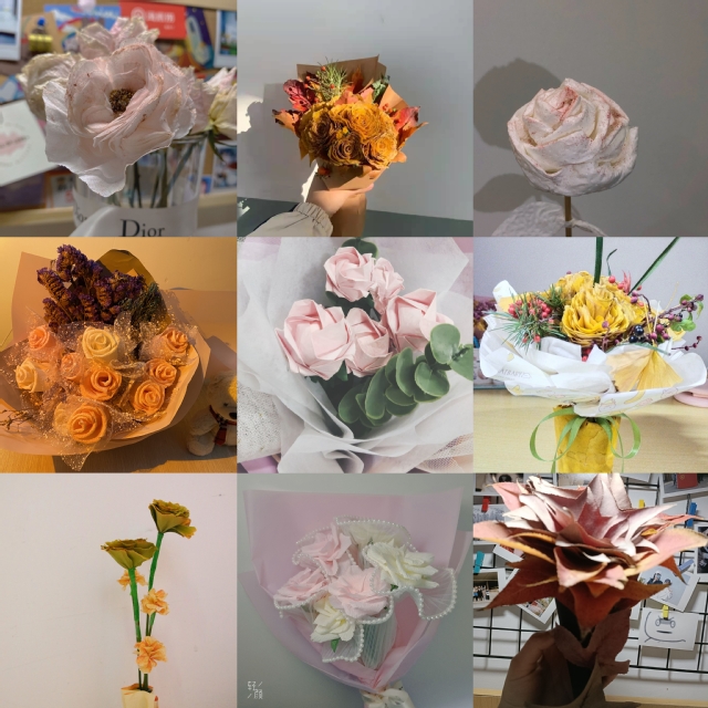 行健服务分队队员分成两批,一批负责登记参与活动的同学姓名及联系方式,一批负责邮箱收集手工DIY花束作品的相关照片。同学们利用课余闲暇时间,自主分组,购买材料,设计花束。通过勤劳灵巧的双手制作出了精美、独特的花束。活动初期部门成员积极筹备,制作海报,在公众号大力宣传,并举行会议讨论活动细节,随后建立了活动工作QQ群方便交流活动事项。活动开始后,安排部员为对活动细节有疑问的同学进行答疑。后期通过邮箱让参赛同学提交作品。