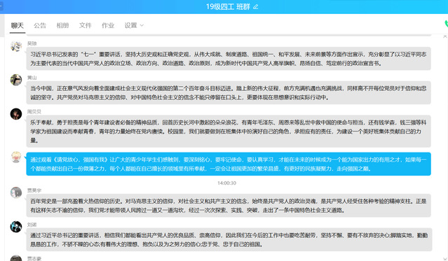 班会伊始,吴琼介绍了本次活动开展的主题与目的。接着,吴琼带大家了解了优秀团员杨光、唐保彬的主要事迹,引导同学们积极履行个人责任和应尽义务,坚定共产主义伟大信仰。其后,全体同学共同观看习近平总书记“七一”讲话视频片段,深入了解中国共产党为人民奋斗牺牲的信仰,以及在任何强敌面前都永不言败的血性和担当。最后,班级同学结合班会内容分享了各自的所想所得。班长张亚静说道:“本次活动让我进一步具体学习和了解了更多关于中国共产党建党百年历史中的细节,学习了百年党史中伟大的中华民族精神,丰富了精神世界,拓展了知识视野,增强了社会责任感和历史使命感,做到以史为鉴,通古鉴今。”