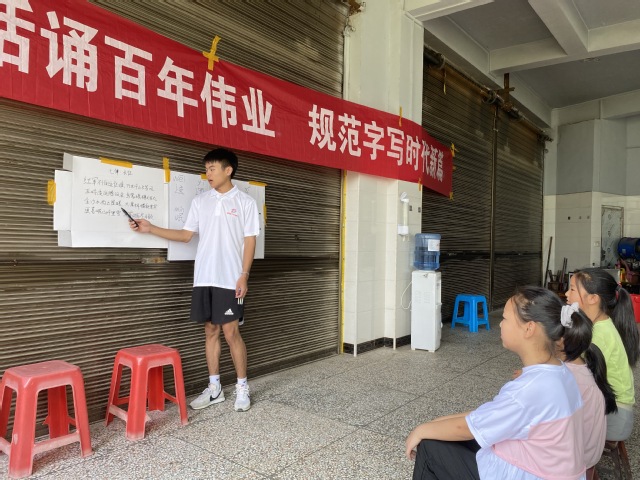 实践队员们于8月5日上午9点集合后在“推普小课堂”开始前布置好场地以及准备相关资料等待小朋友们的到来。当今,推普工作的重点区域就在乡村。因为大多数城镇人口基本已经掌握普通话,但水平参差不齐,在老少边穷地区的普通话普及率相对较低,故在广大农村自然就成为了目前推普的主阵地。实践团成员将推普工作与红色元素相结合,不仅要把普通话带进农村,更要把红色故事讲到农村。以普通话为媒介,传播红色故事,深化小朋友内心深处的民族文化认同感。