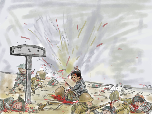 团队成员于莎莎绘画了在台儿庄战役中革命英雄英勇奋战的战斗场景。在台儿庄战役中,面对日军五万余人的强烈进攻时,中国革命英雄不畏强敌,勇往直前,为人民和国家牺牲战场也在所不辞。正是因为英雄们的英勇奋战赢得了台儿庄战役的胜利,在政治上增强了全国军民抗战必胜的信心,鼓舞了抗日军队的士气;团队成员赵伟绘画了竖立在英雄广场上的革命烈士纪念碑。在蓝天的衬托下,高耸的革命烈士纪念碑显得格外威严。碑高31.8米,碑正面“革命烈士永垂不朽”八个大字采用毛泽东同志手写体,背面刻有中央军委原副主席张震将军撰写的碑文。在纪念碑的前面,是一幅幅随风飘扬的国旗,鲜艳的红色在空中更加夺目;团队成员李嘉欣绘画了台儿庄战役中的领导者与革命者。绘画整体采用了红色为背景,与革命旗帜融为一体,表现出当时战争的残酷,但革命烈士们勇往直前的牺牲精神却永不磨灭。