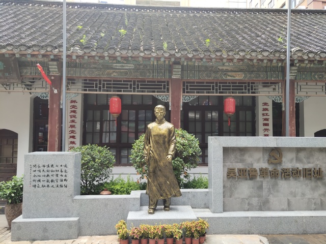 下午两点,两位队员抵达吴亚鲁革命活动旧址。调研发现,旧址早已不是记录中机关大院的样子,而是被繁华的商业圈包围,灰砖黛瓦的老式平房与其背后的高楼大厦形成了鲜明的对比。当团队成员在熙熙攘攘的人群中路过这老房子,看到房前吴亚鲁先生的塑像,队员们多了份肃静与敬仰。经讲解员的介绍后,两位队员了解到吴亚鲁烈士作为早期共产党员,吴亚鲁受组织委托,来到徐州参与筹建地方共青团和党组织的革命工作,使徐州市成为江苏省第三个建立共青团的城市。在了解吴亚鲁烈士的革命生涯和革命活动旧址历史后,实践队队员根据所掌握的情况并结合学习体会,在活动旧址的房前录制了吴亚鲁革命活动旧址的简介视频。。